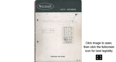 This was my first climbing logbook. Unfortunately it is not complete, as the first seven pages have been torn out (presumably by myself – probably because they contained details of tree climbing and buildering that I later found embarrassing.) Also, I have omitted some early southern sandstone climbing between autumn 1967 and spring 1968.