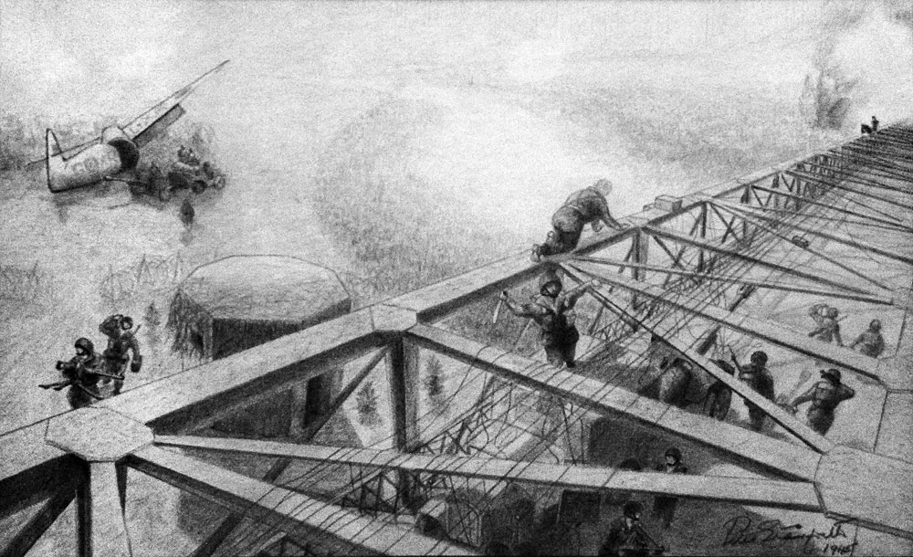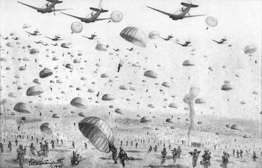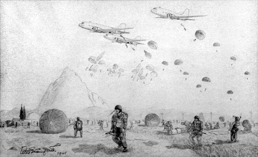 Detail from Dad’s vivid picture of jumping in the night in Sicily in 1943. Click image for the full extraordinary original.