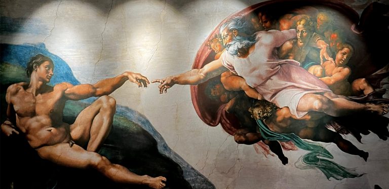 The most famous image in the ceiling paintings – perhaps the most famous in the whole history of art – is “The Creation of Adam” in which Adam and God reach out to each other with pointed fingers that don’t quite meet. Here Michelangelo is expressing his new-found spiritual belief, influenced by the Reformation, that man could communicate with God directly through the intellect. With the added implication that the Church itself could be bypassed.