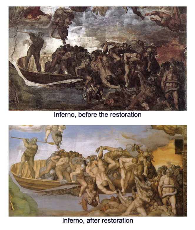 Over the centuries, the Sistine Chapel frescos became so soiled by “layers of unsaturated fat from five hundred years’ worth of candles and oil lamps, together with thick layers of glue and linseed-oil varnishes slathered across the fresco during multiple incompetent restorations” (Ross King p.123) that by the 1980s cleaning and restoration had become essential. This involved first making repairs to the plaster before removing the grime with special solvents. Then, where necessary, retouching was carried out using water colours (though some areas were deliberately left unrestored as a historical record). Finally, a “light layer of acrylic” was applied to protect the surface.