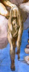 Some claim Michelangelo was referring here to his own ‘martyrdom’ involved in the labour of making the painting, but a more likely explanation was that he had been experiencing an agonising split with Christian orthodoxy in that his personal beliefs still retained elements pagan Humanism. To which extent he regarded himself as a sinner, not worthy of the Catholic church. When he was dying he said, “I regret that I have not done enough for the salvation of my soul.” Today he is best regarded as belonging to a school of “Christian Humanists”.