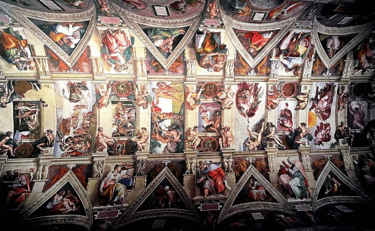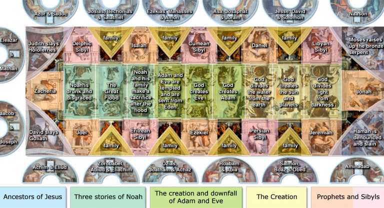 He proceeded from east to west, starting from the entrance of the Chapel to finish above the altar with a panel depicting God separating light from darkness.